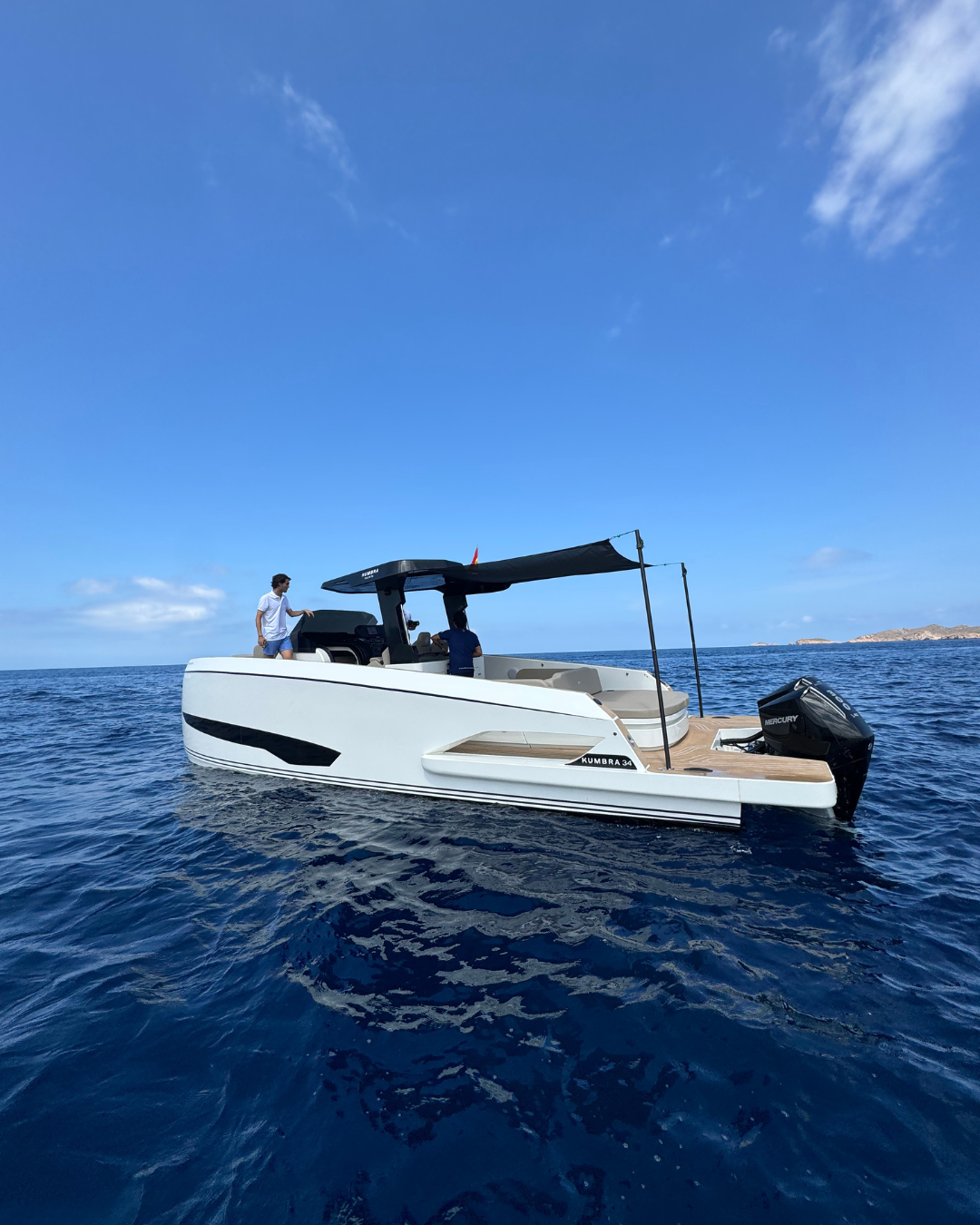 Explora la costa con estilo a bordo del Kumbra 34, una lancha motora que combina elegancia, confort y potencia para ofrecerte una experiencia única en el mar. Con capacidad para hasta 12 personas, es la embarcación perfecta para disfrutar de una escapada en grupo, un día de aventura o una salida romántica por las aguas cristalinas.
