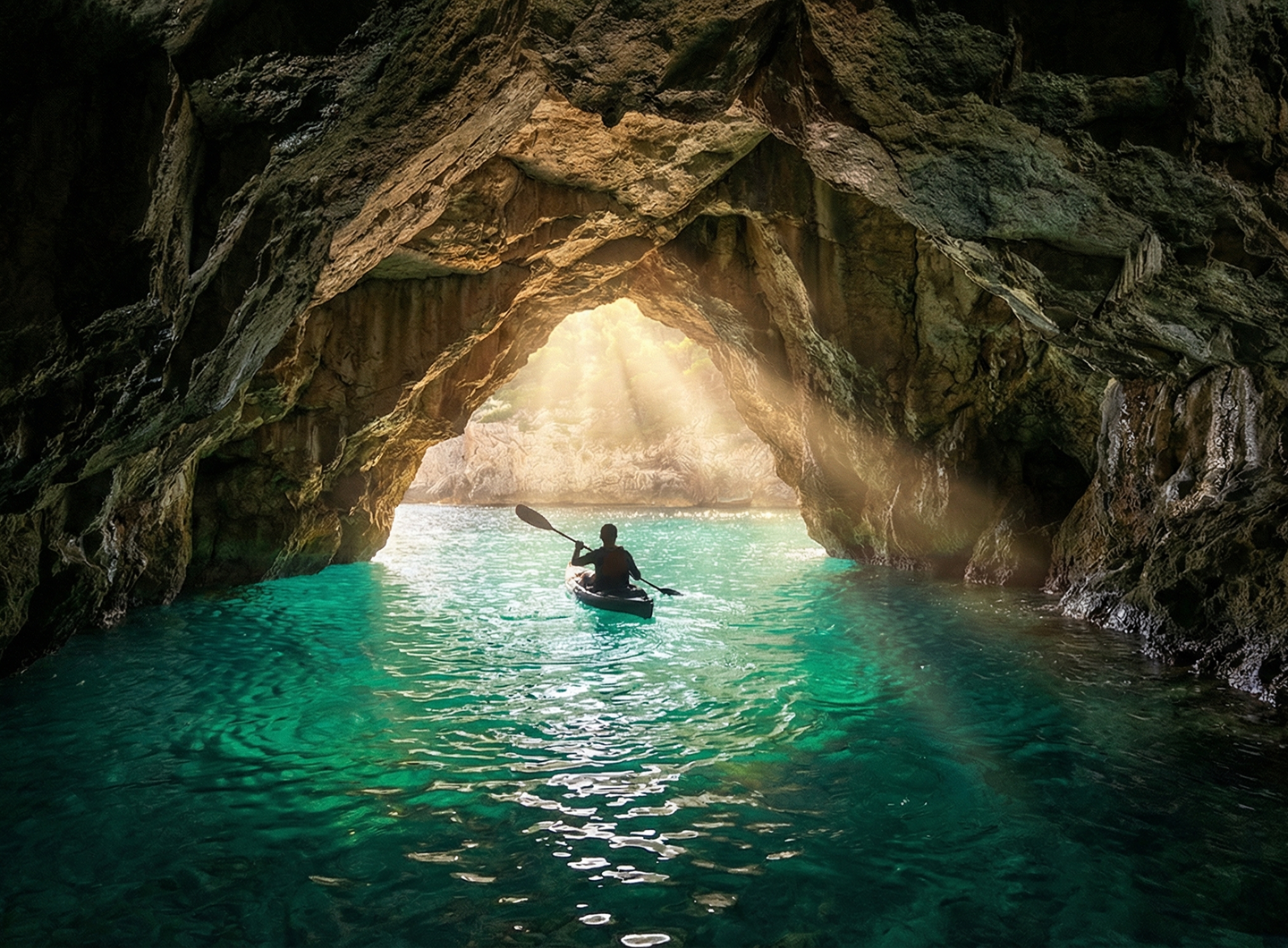 La Cueva de los Piratas se abre en los acantilados de la costa suroeste. Entramos remando con el kayak hasta su interior, donde el agua cambia de color y el silencio lo envuelve todo. Zona perfecta para snorkel y, si te atreves, para saltar desde los acantilados.